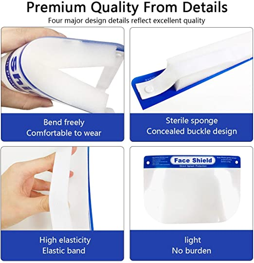 • HIGH QUALITY MATERIALS - The plastic face shields is made of super transparent recyclable PET + sponge material. Lightweight and clear for maximum visibility.